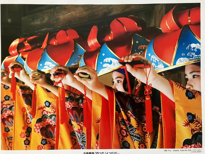 琉球舞踊のなかでもよく知られた祝儀踊です。古くから音を鳴らすことは、その場を清めると考えられていました。花笠に紅型、色鮮やかな衣装が印象的です。